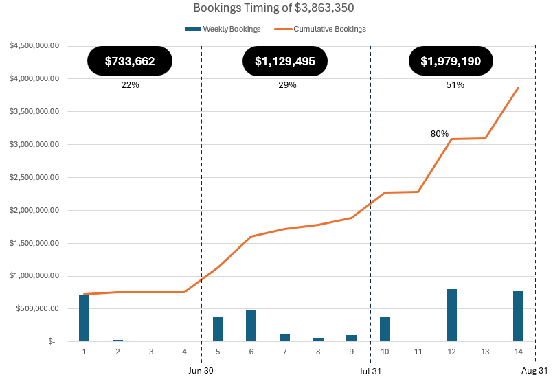 With just 25% of the salesforce achieving this “quick start” goal, the impact on quartely spread is significant. The company reaches 80% of its target with two weeks to spare, showcasing impressive progress and a well-managed sales pipeline.