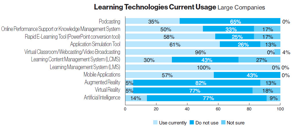 In a 2022 training industry study, 47% of organizations surveyed will maintain some remote learning instituted during the pandemic, and only eight percent will return to pre-pandemic classroom norms (Freifeld, 2022). The training industry reached a budget of over 100 billion dollars in the US for the first time, the majority of which is designated for technology, 39% being LMS systems (Freifeld, 2022). Large companies primarily rely on videoconferencing (or webcasting) to conduct their training and LMS systems; however, they are experimenting in other areas, as shown in Figure 1.