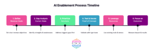 Effective enablement begins with alignment to the organization’s most critical revenue objectives. These goals could include increasing win rates, shortening sales cycles, improving forecast accuracy, or expanding customer retention. Without clarity on these outcomes, AI adoption risks becoming just another shiny object.